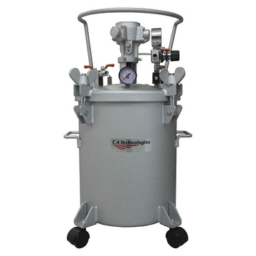 The 5 gallon, non-ASME, pressure tank (pressure pot) from C.A. Technologies come configured with either single (51-503) or dual regulators (51-504) and pneumatic agitation (mixer). The tank is constructed of heavy gage steel with a baked on enamel finish and has wheels for maneuverability or optional stationary feet.